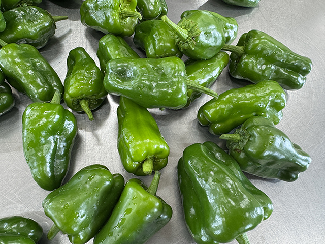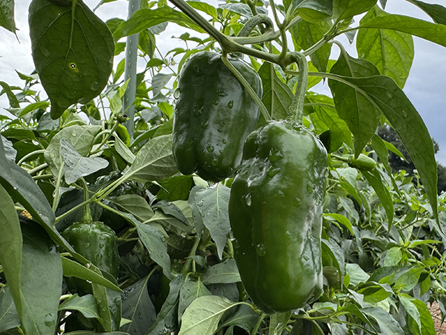 朝の畑には昨夜の雨粒が残り、ピーマンがつやつやと光っていました。