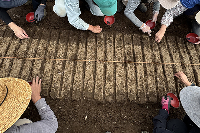 学校では地床に畝の短辺方向10センチ間隔で溝を掘り、1センチ間隔で播種を行いました。