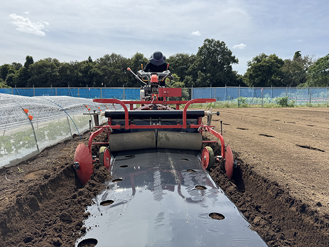 4畝にマルチを張り、午前中に2畝を定植、防虫シートをかけてお昼に。