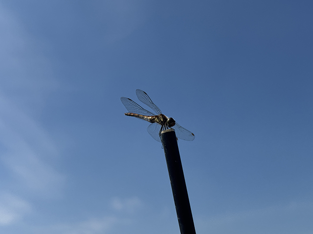 昼休みには支柱の先端でトンボがひと休み。秋の気配を感じるワンシーンでした。