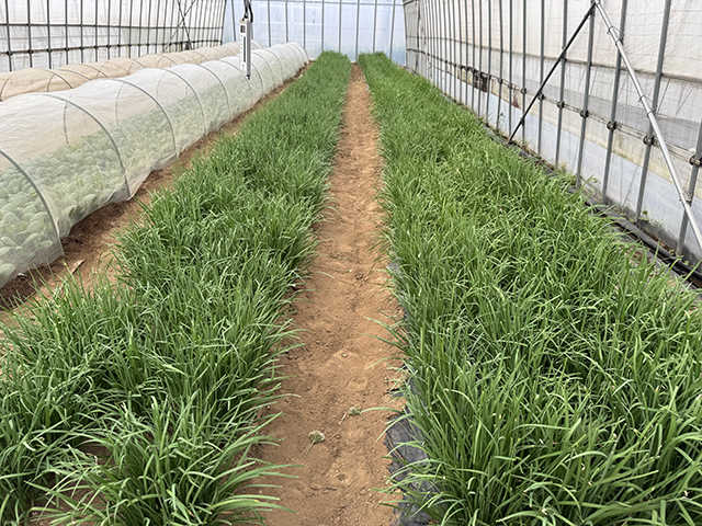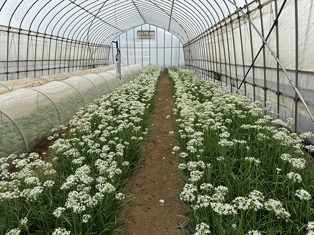 Bハウスではニラの白い花が一面に——今朝まで。