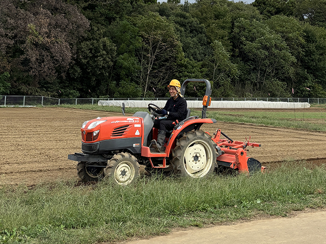 堆肥とボカシ肥を元肥として施し、初めて触る機種のトラクターで耕運。