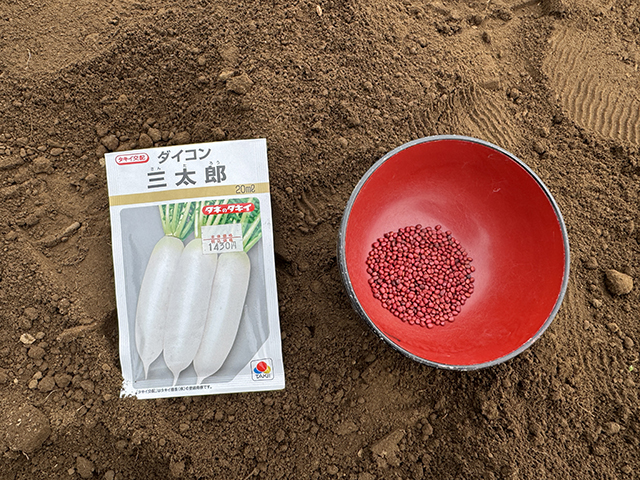 「三太郎」と「紅くるり」を3粒ずつ、リズムよくまいていきます。