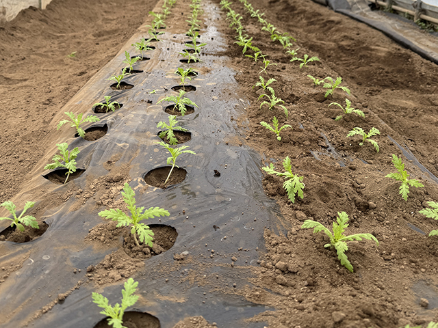 春菊は少し密に植えると、上にすっと伸びて形が整うそうです。