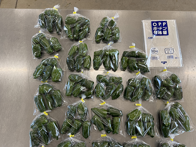 ピーマンは1袋150g以上を目安に、大きめは4個、小ぶりのものは5個入りで選別。