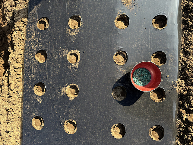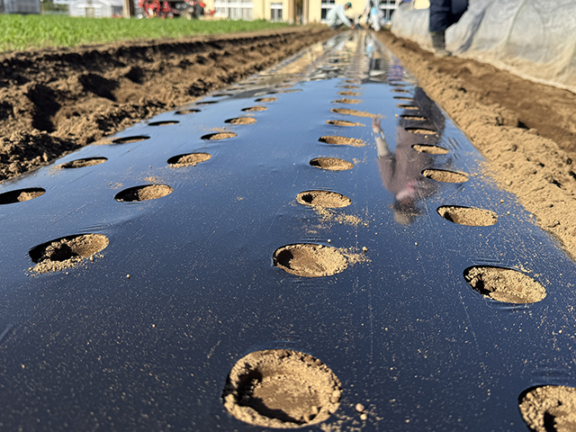 黒マルチ(9415)に5粒ずつ播き、防虫ネットでしっかりカバーしました。
