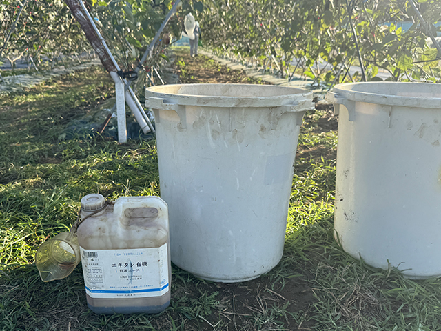 その後の追肥作業では、バケツ40リットルの水にエキタン有機を1000倍に薄め