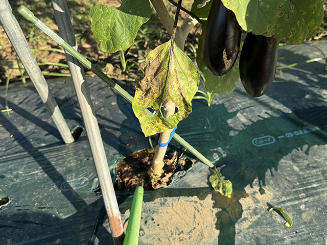 ナスやピーマンなどの株元へたっぷりと潅水。