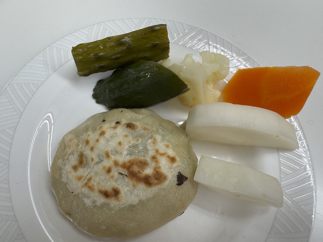 香ばしい焼き目のついたおやきと、出来たてのピクルスを一緒にいただきました。
