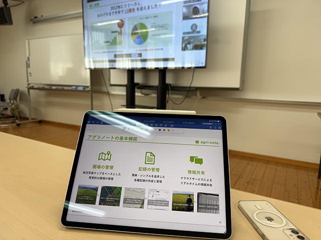 3限目はオンラインで、営農支援アプリ「アグリノート」の担当者による講義が行われました。
