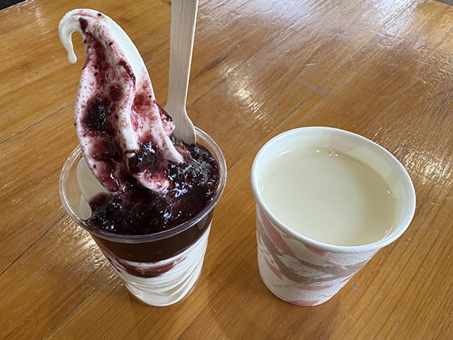 豆腐づくりの現場を見学したあと、ブルーベリーソースのかかったアイスと