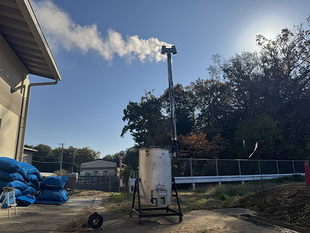 筒形の燻炭機に火を入れると、独特の香ばしい匂いがふわっと広がり、