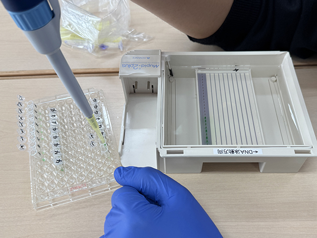 まずPCR産物をピペットで吸い上げ、寒天ゲルの小さな穴(ウェル)にそっと落とす工程。