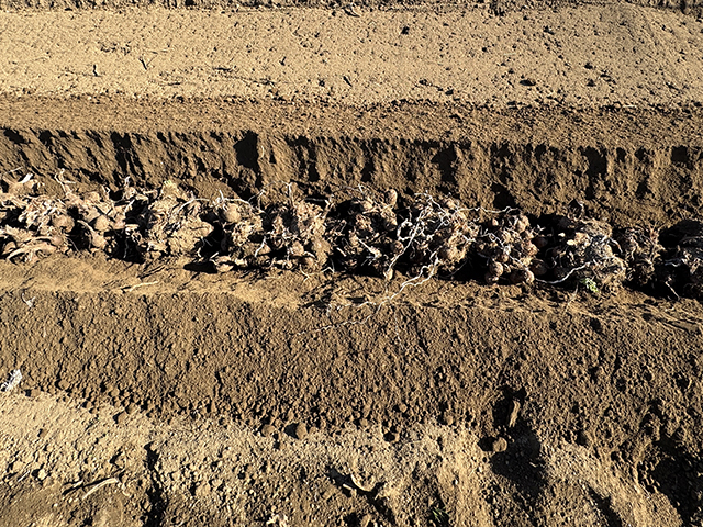 畑貯蔵は、一度掘り上げたサトイモを、霜害を防ぐために掘った溝へ埋め戻して保存する方法です。