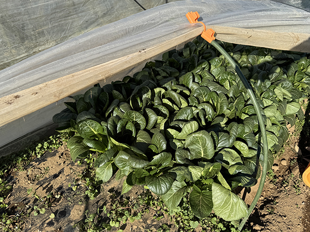 トンネル被覆で育ったコマツナは、葉色も濃く、張りのある仕上がり。