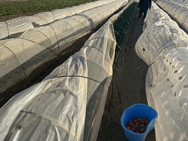 一通りの作業を終えて帰る準備をしていたところ、強風の影響でホウレンソウ畝のトンネル被覆や防虫ネットが