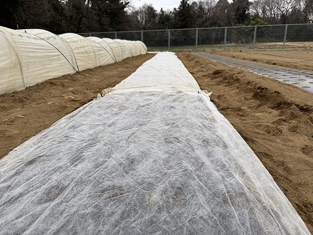 先週播種したニンジンのベタ掛けとトンネル被覆で保温対策。