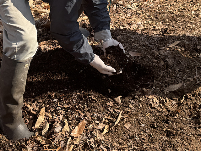 田んぼの土づくりには、雑木林から採取した落ち葉が分解された腐植土(山土)を活用。