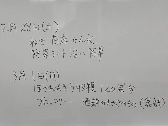 明日の日曜日当番はホウレンソウ120袋分の収穫とのこと。