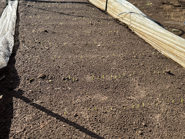 トンネル被覆とベタ掛けをめくると、ちいさな芽が顔を出していました。