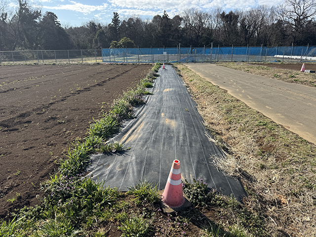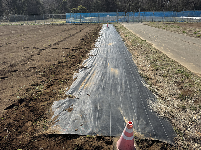 防草シート際はトラクターでの耕耘が難しく、ここはマンパワー投入エリアです。