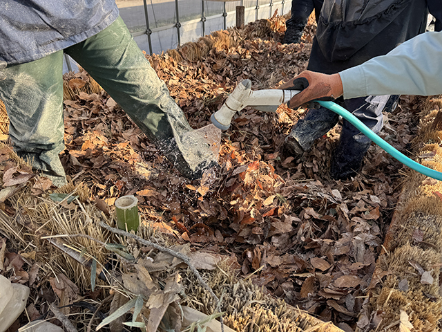 落ち葉をベースに、鶏糞と米ぬかを混ぜて水をかけながら踏み込み、これを